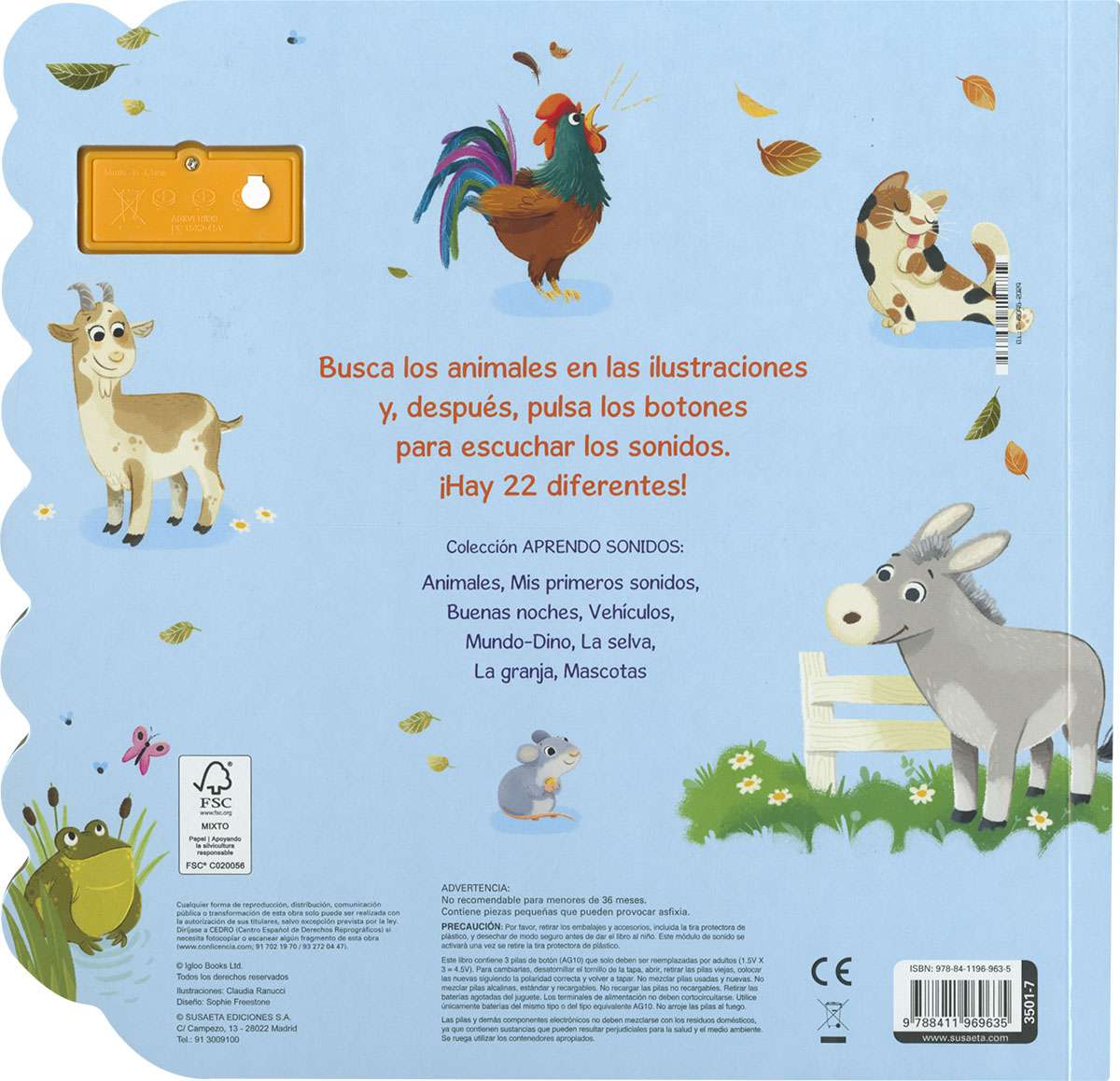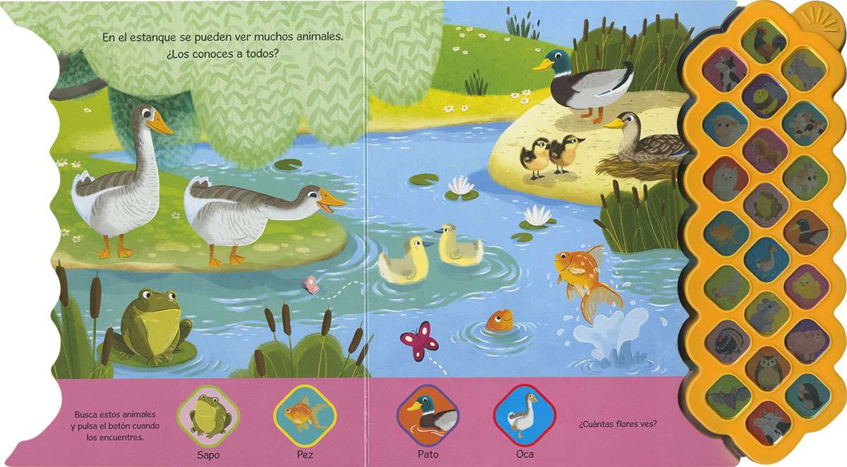Busca los animales en las ilustraciones y pulsa los botones para escuchar su sonido. ¡Hay 22 diferentes! Podrás oír a la oveja, al burro, al caballo, al pato... ¡a todos los que conoces!