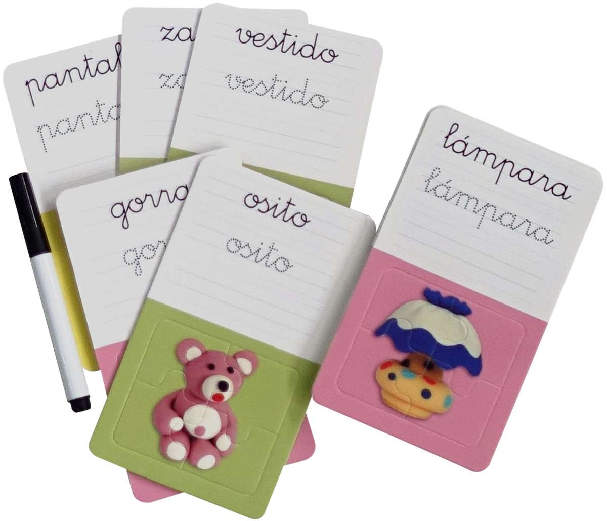 Una divertida caja en la que encontrarás 15 tarjetas dobles con 30 minipuzles de objetos y sus nombres para jugar, aprender y escribir; 1 rotulador borrable que permite volver a utilizar las tarjetas nuevamente, y 1 libro para jugar a adivinar palabras.