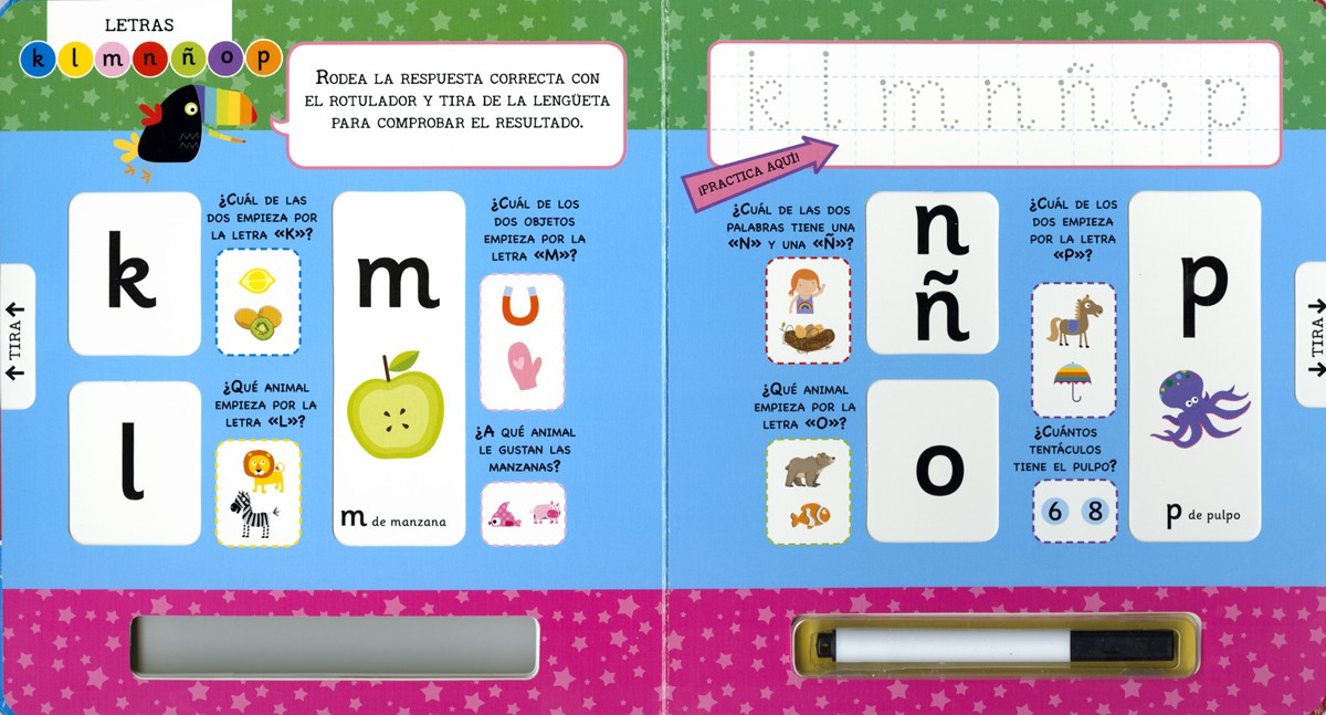 Un libro interactivo para que los más pequeños aprendan el abecedario. Contiene un rotulador especial para rodear las respuestas y divertidas lengüetas para tirar y comprobar el resultado.