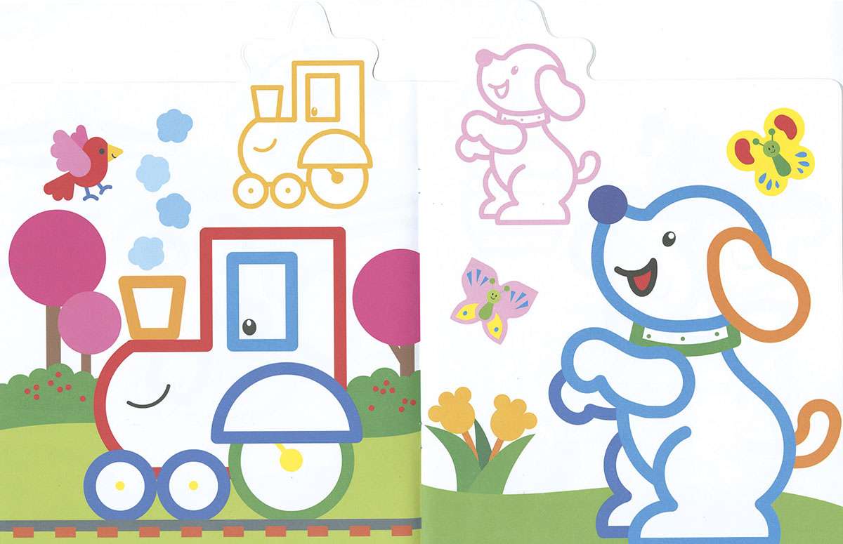 Kokatu eranskailu bakoitza dagokion tokian eta margotu marrazkiak. Bilduma polit honetan, irudiak etxeko artista txikien adinari egokituta daude.