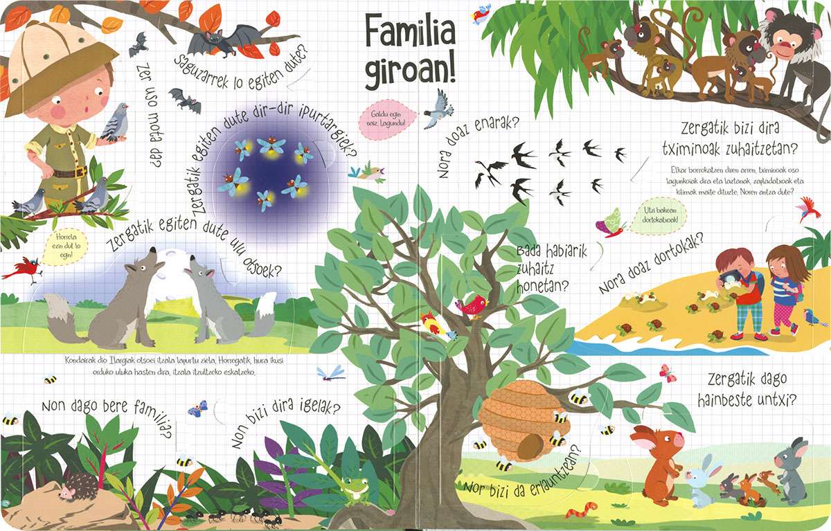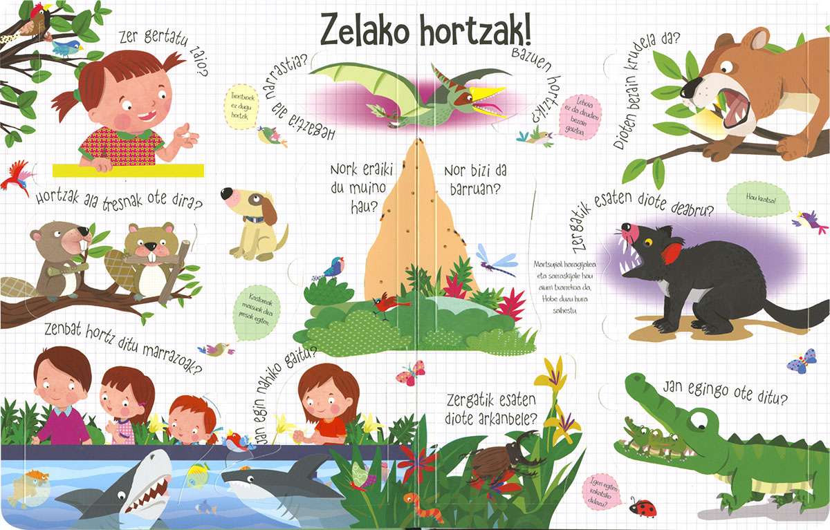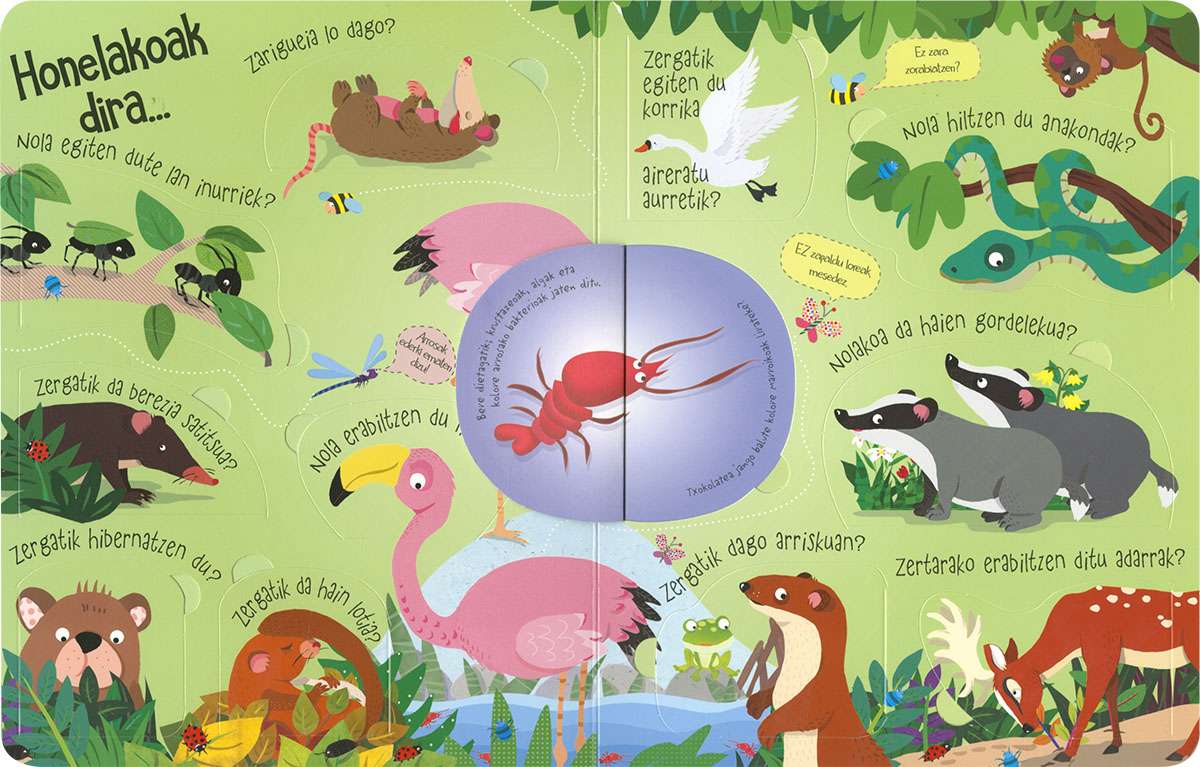 Liburu honen hegalak zabalduz gero, inoiz zeure buruari egingo zenizkion animalien munduari buruzko galdera askoren erantzunak topatuko dituzu. Harritu zaitez eta ikasi zergatik diren arrosak flamenkoak, zenbat hortz dituzten marrazoek, zergatik dauden kaktusak basamortuan eta askoz kontu gehiago.