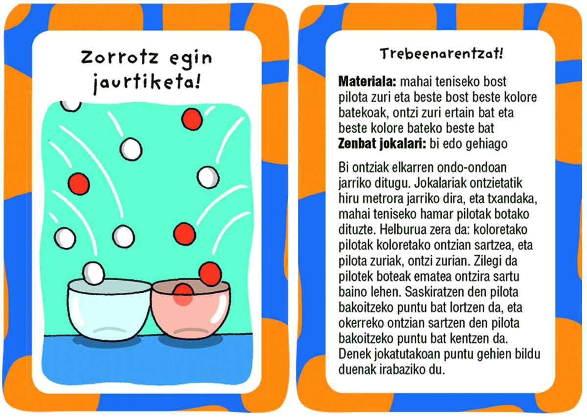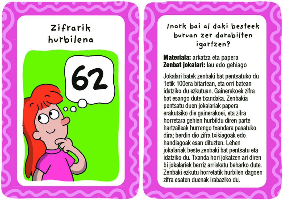 Karta sorta ezin dibertigarriagoa, inoiz ez aspertzeko. Joko motzak eta luzeak aurkituko dituzu barruan, bi lagunek edo askoz gehiagok jokatzeko modukoak, sukaldeko erezeta errazak, eta baita eskulanak ere, sormena landu dezazun. Zabaldu kaxa eta hasi jolasean! 52 ideia dituzu aukeran!