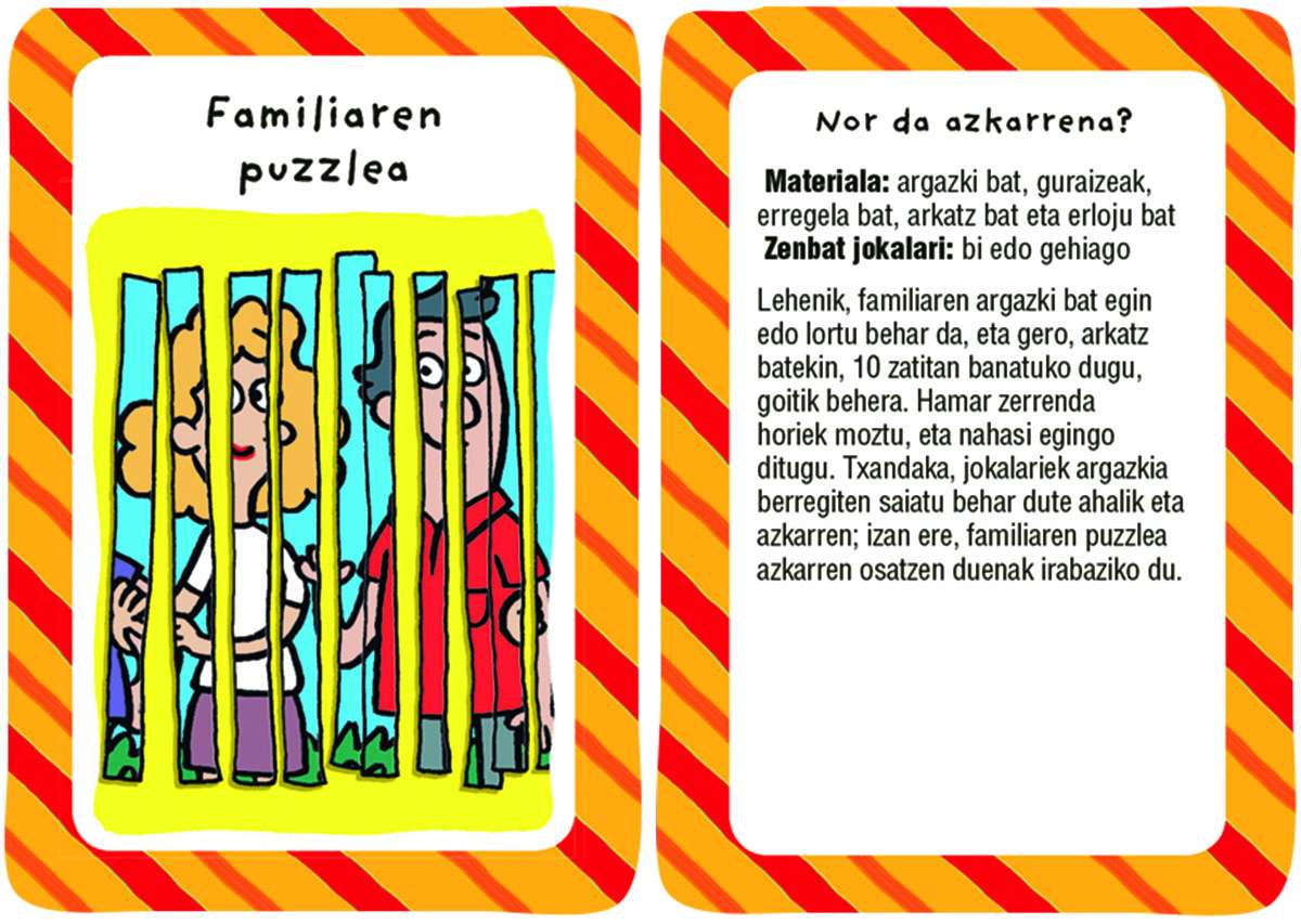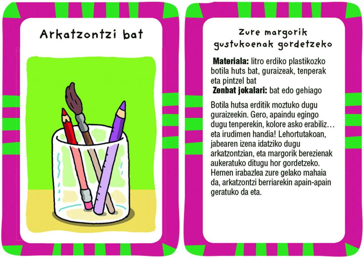 Joko eta jardueren karta sorta ezin dibertigarriagoa, inoiz ez aspertzeko. Joko motzak eta luzeak aurkituko dituzu barruan, bi lagunek edo askoz gehiagok jokatzeko modukoak, sukaldeko errezeta errazak, eta baita eskulanak ere, sormena landu dezazun. Zabaldu kaxa eta hasi jolasean! 52 ideia dituzu aukeran!