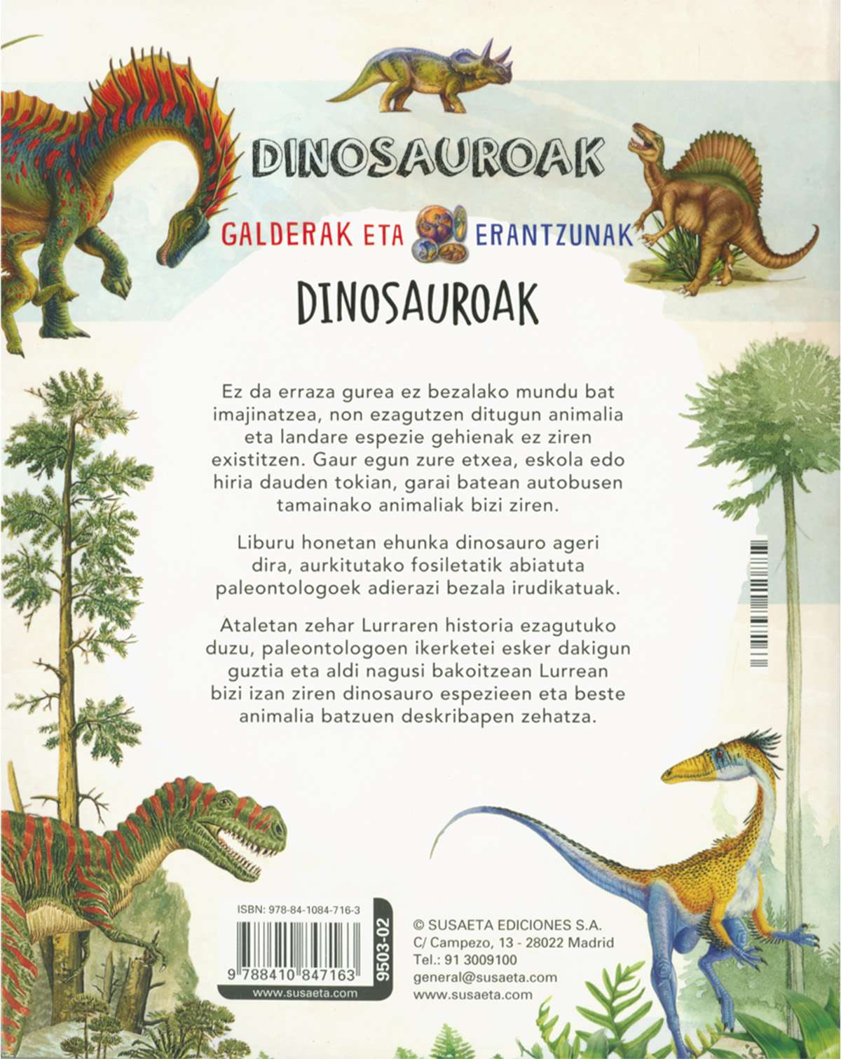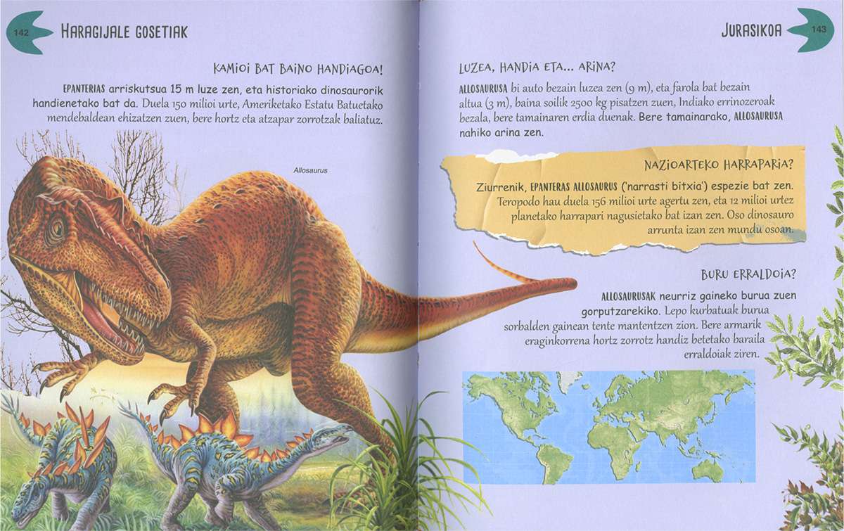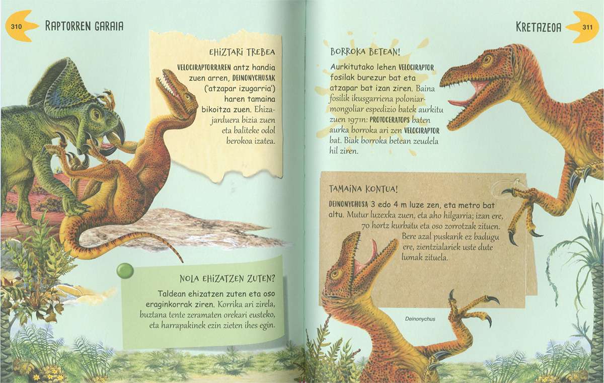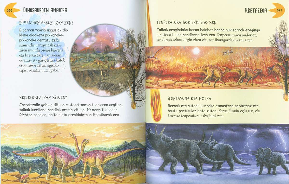 Ez da erraza gurea ez bezalako mundu bat imajinatzea, non ezagutzen ditugun animalia eta landare espezie gehienak ez ziren existitzen. Gaur egun zure etxea, eskola edo hiria dauden tokian, garai batean autobusen tamainako animaliak bizi ziren. Liburu honetan ehunka dinosauro ageri dira, aurkitutako fosiletatik abiatuta paleontologoek adierazi bezala irudikatuak. Ataletan zehar Lurraren historia ezagutuko duzu, paleontologoen ikerketei esker dakigun guztia eta aldi nagusi bakoitzean Lurrean bizi izan ziren dinosauro espezieen eta beste animalia batzuen deskribapen zehatza.