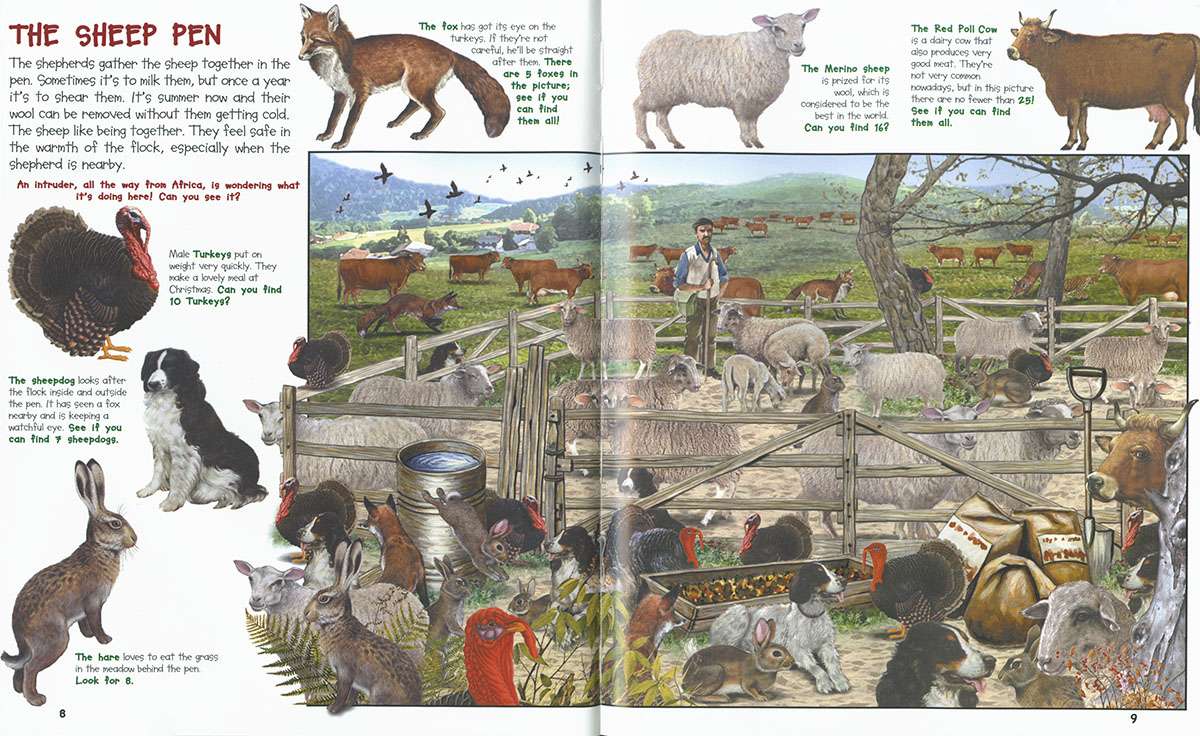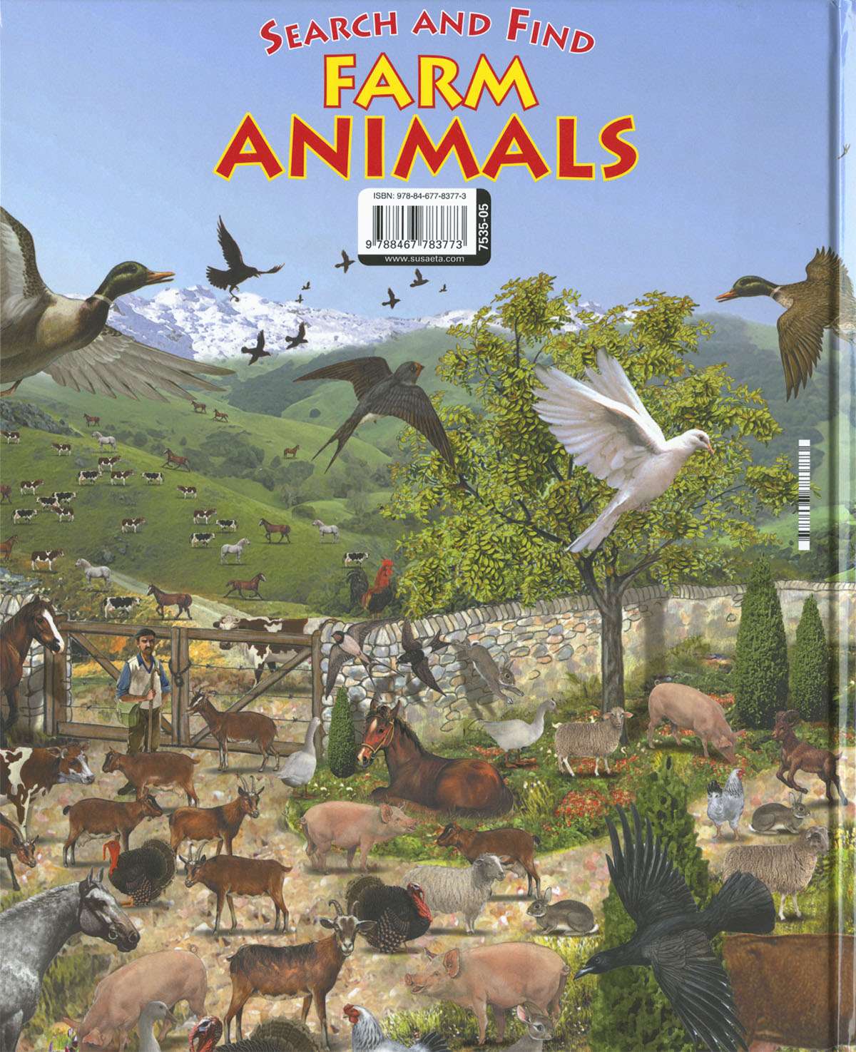One more title in this series to learn and enjoy looking for the numerous animals, people and objects of all kinds that are hidden within the illustrations. The most common animals that live on a farm: visit the stable, the pigsty, the chicken coop... quite a challenge!
