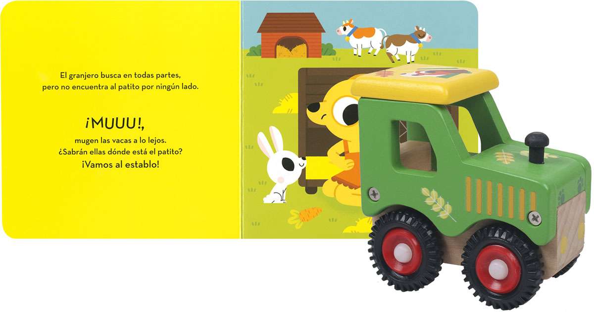 Koadernaketa: Caja de cartón plastif. mate, cont.: libro de cartón troquelado y un tractor de juguete de madera