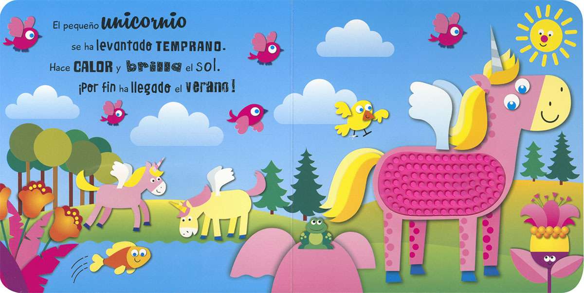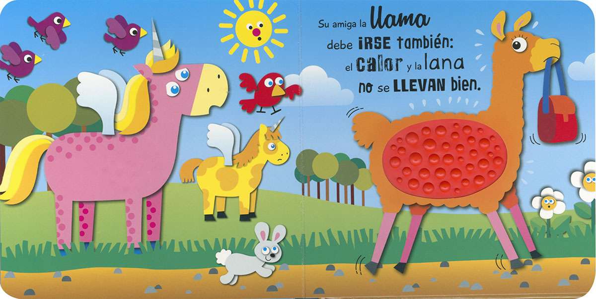 Acércate a tus animales favoritos y tócalos. ¿Qué sientes? ¿Es igual el unicornio que la llama? Un libro con simpáticas rimas y llamativas texturas para percibir, divertirse y experimentar.