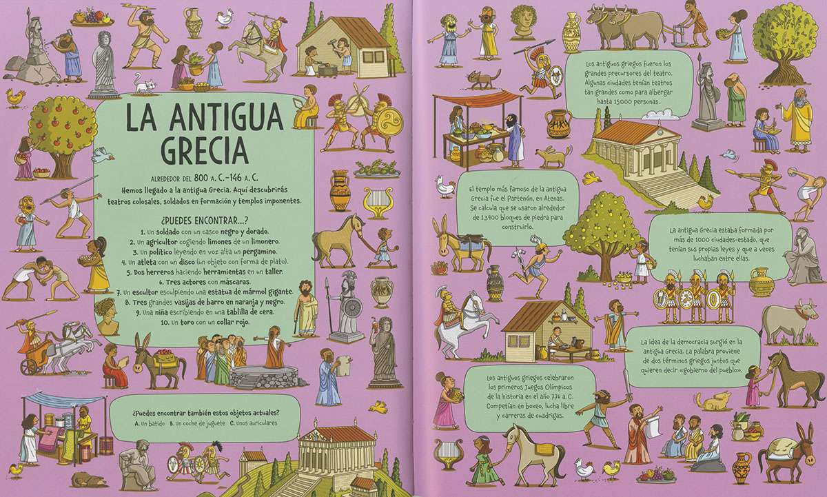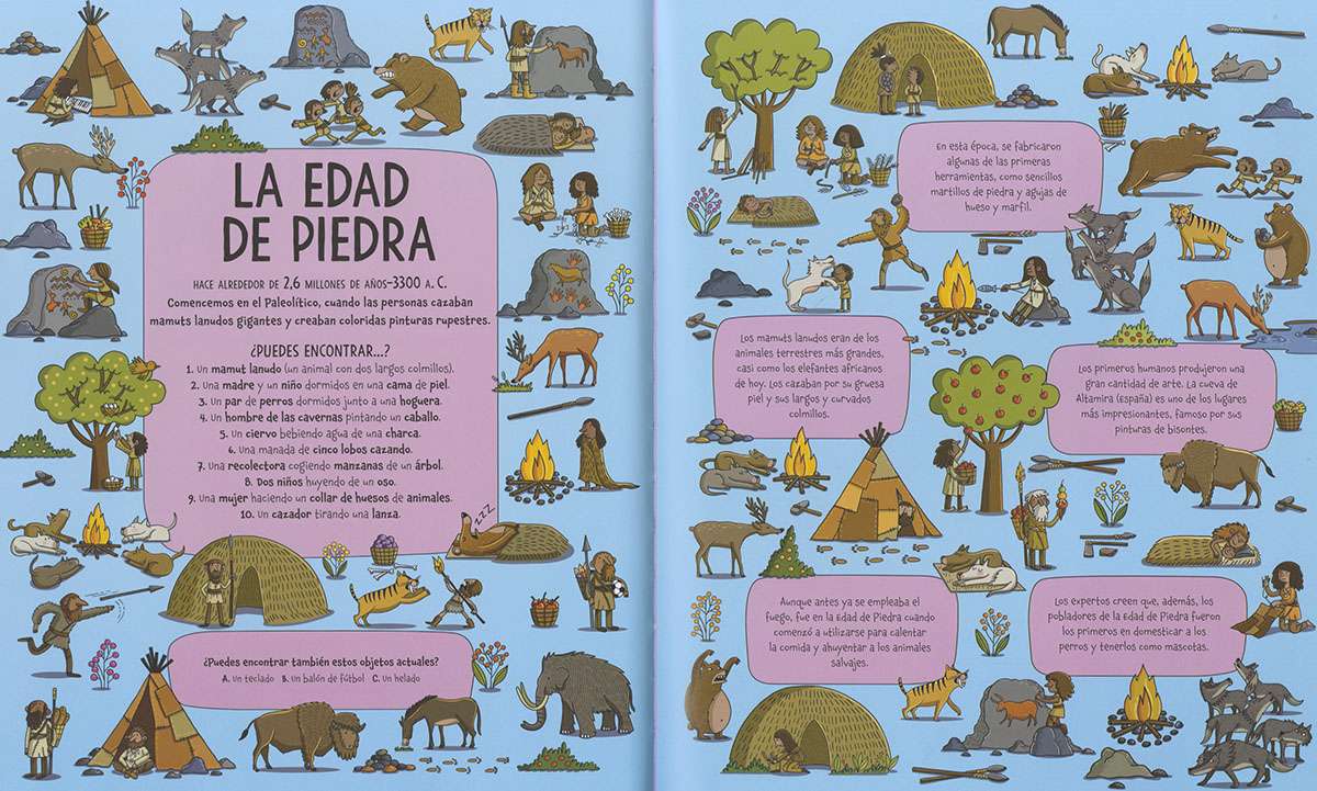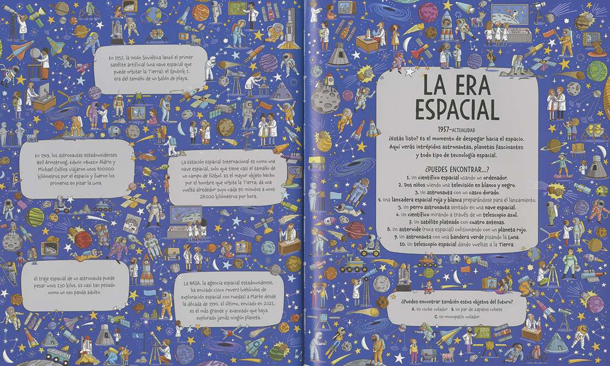 Viaja en el tiempo con este magnífico libro de buscar. Desde la edad de piedra hasta la era espacial, pasando por la antigua Roma, navegando con los vikingos o merendando en la edad media. Hay más de 150 objetos que encontrar y muchos datos históricos apasionantes.