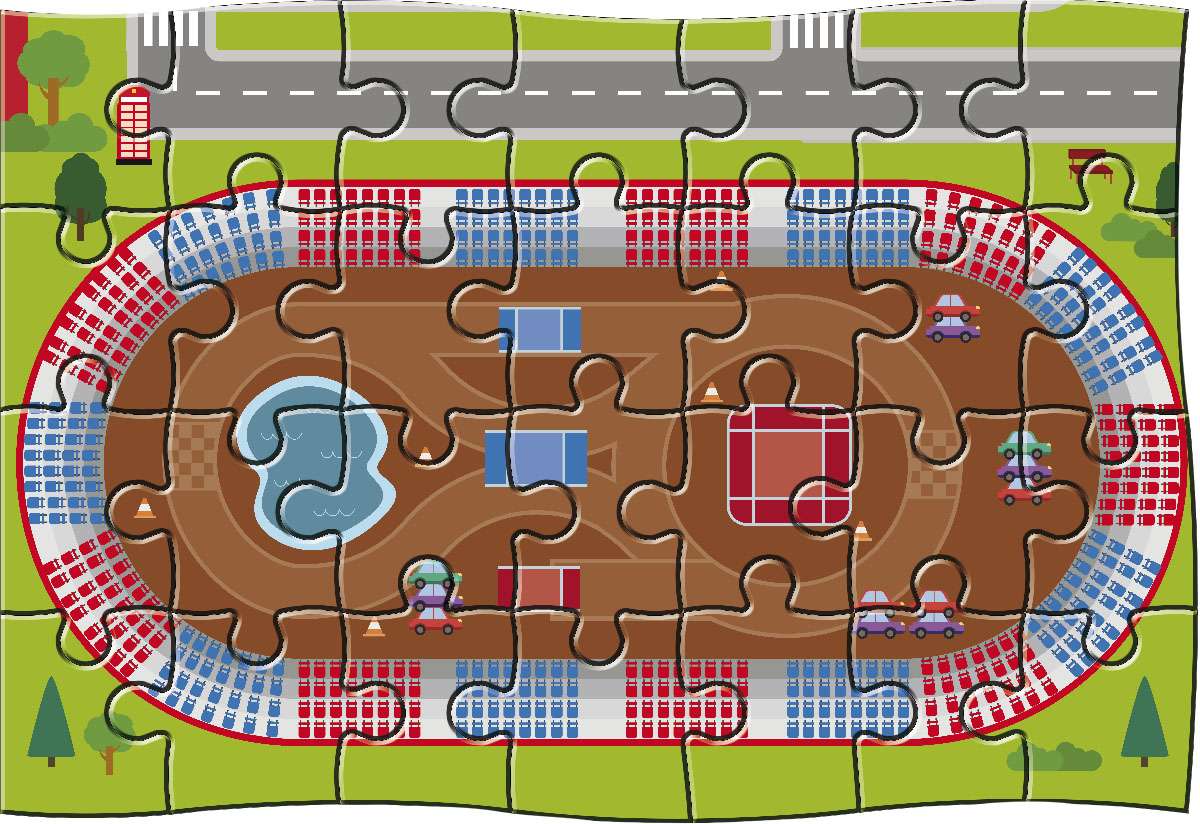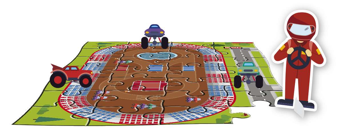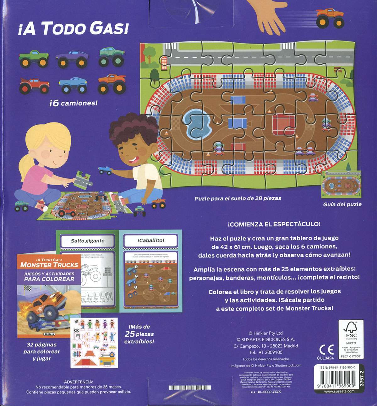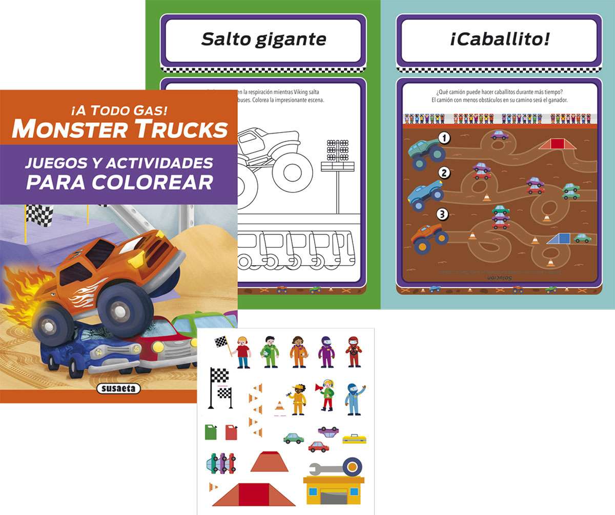 Un completo kit infantil que incluye un libro de actividades para colorear, un puzle gigante de 28 piezas, figuritas extraíbles y 6 camiones con cuerda hacia atrás con los que divertirse... ¡a todo gas!