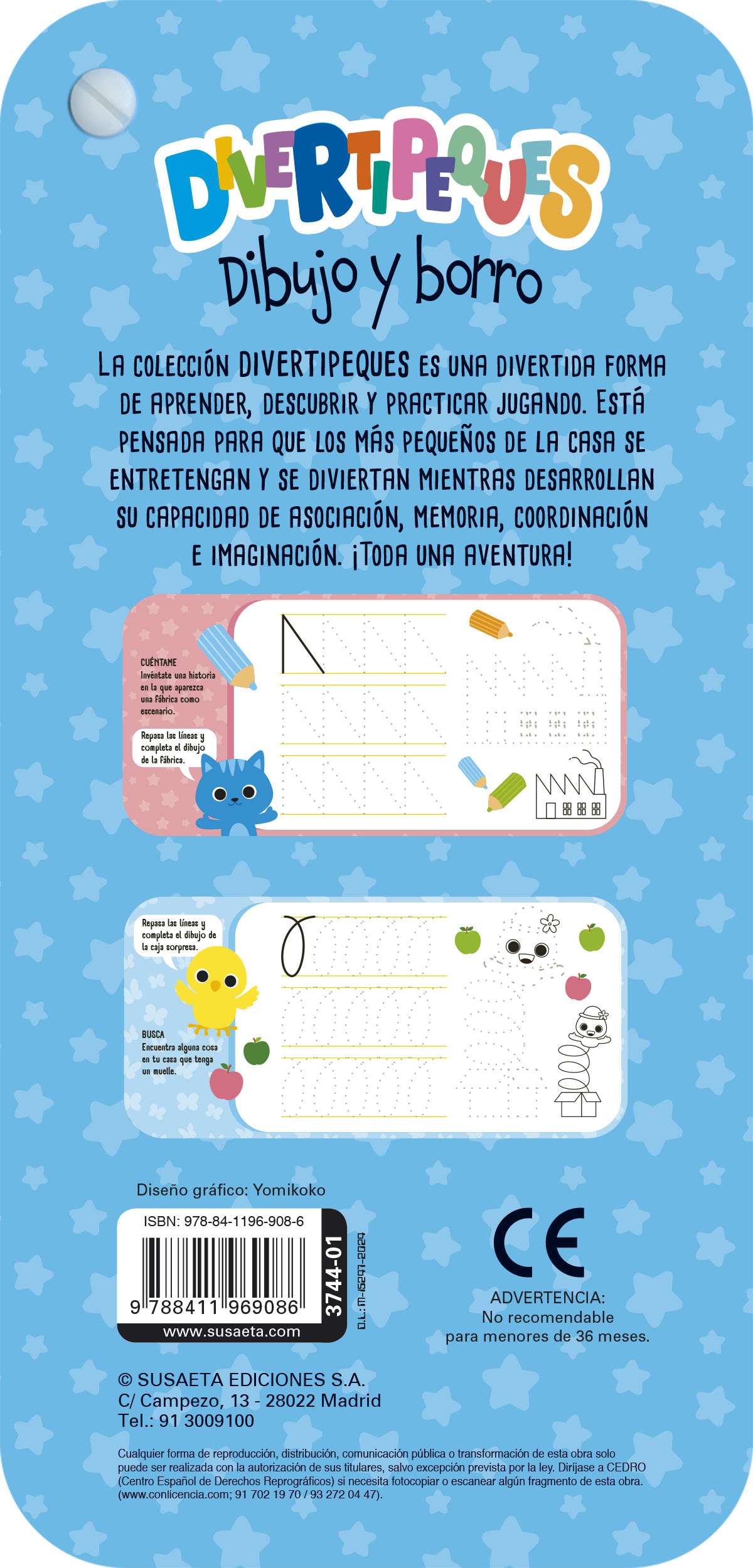 Una divertida forma de aprender, descubrir y practicar jugando. Con la colección DIVERTIPEQUES los más pequeños de la casa no solo van a encontrar un gran entretenimiento, sino que además sus distintas actividades potenciarán su capacidad de asociación, memoria, coordinación e imaginación. En este título encontrarás actividades para observar, identificar y practicar trazos, además de juegos y pasatiempos asociados a ellos para compartir y divertirte. No te preocupes si algo no te sale; gracias al rotulador borrable, puedes escribir y borrar cuantas veces quieras.
