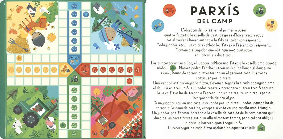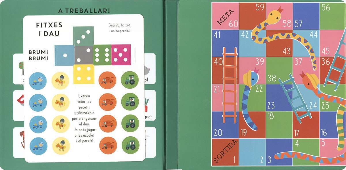 Obre aquest llibre i viu una aventura! Escull un lloc per a desplegar-lo a terra i enfil't al tractor: conrearás un hort, alimentarás els cavalls... i farás un munt de coses més! Inclou 2 jocs de taula amb fitxes i dau per a muntar.