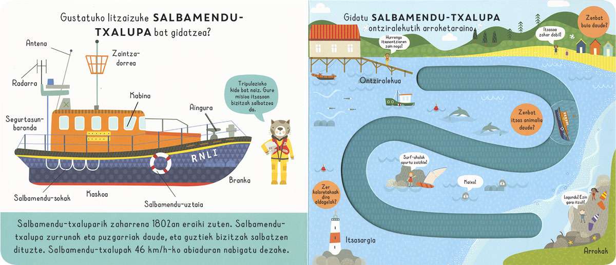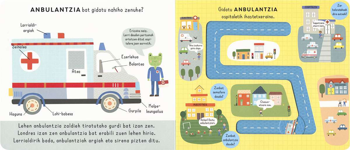 Suhiltzaileen kamioia gidatu nahiko zenuke? Eta salbamendu-txalupa? Kartoizko liburu honetan hori guztia egin ahalko duzu: mugitu diskoa seinalatutako bidetik eta ikasi ibilgailu bakoitzari buruzko kontu ugari. Bost ibilgailu ezberdin gidatuko dituzu!