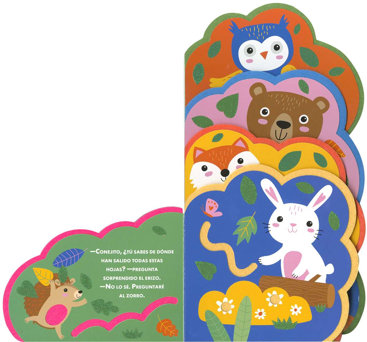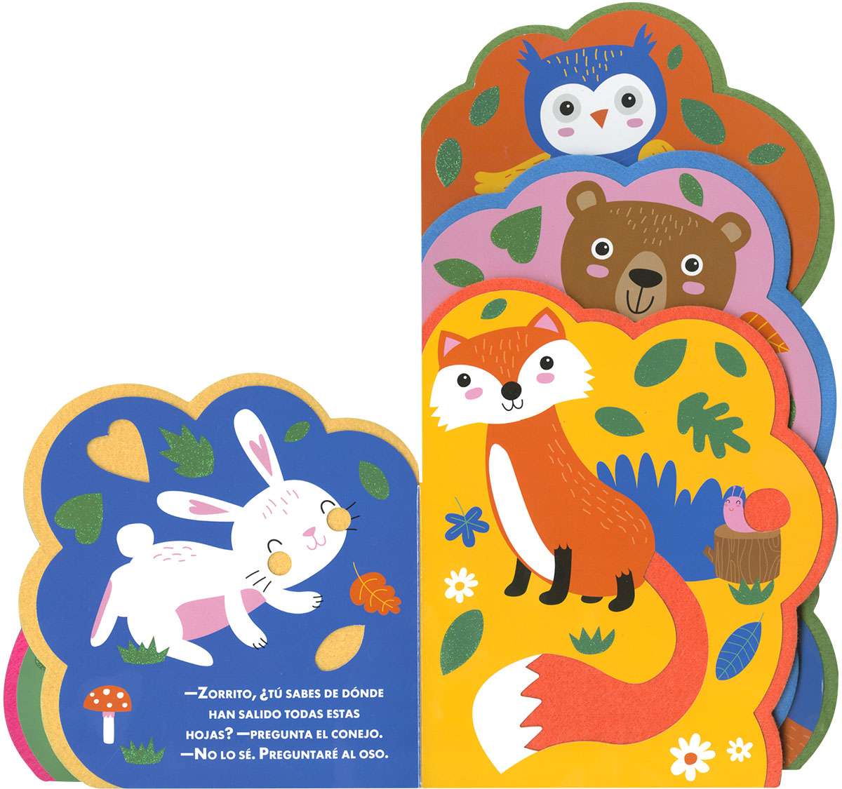 Los simpáticos animales de este libro viven en el bosque. Les gusta reír y jugar, y rodearse de cosas suaves y brillantes; por eso en este libro las páginas troqueladas tienen los bordes de fieltro y las flores tienen purpurina: para que los niños disfruten de su lectura igual que los animales de nuestro bosque.