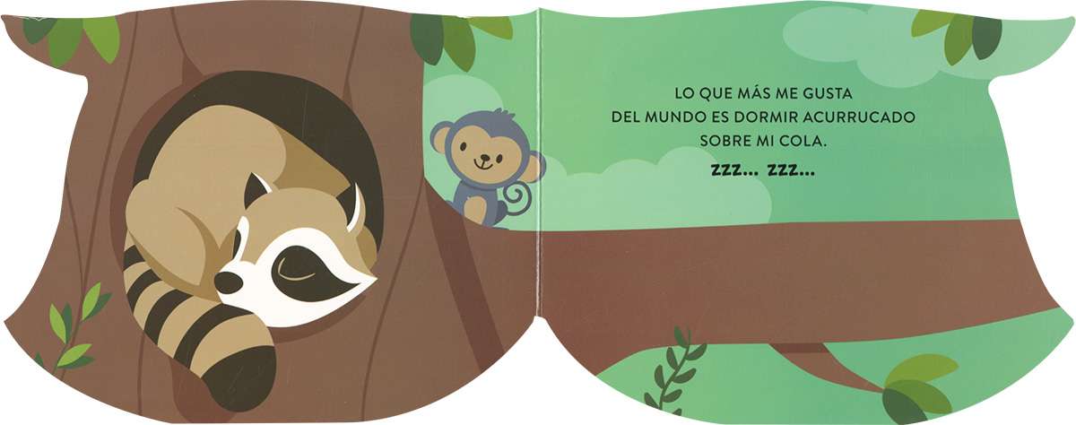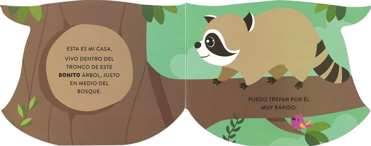 ¿Quién es este bonito animal? Parece que lleva una máscara en la cara... ¡Exacto, el mapache! ¿Sabes qué le gusta? ¡Tendrás que leer el libro para averiguarlo! Un original libro de cartón troquelado con la forma del mapache, ojos y nariz de plástico.