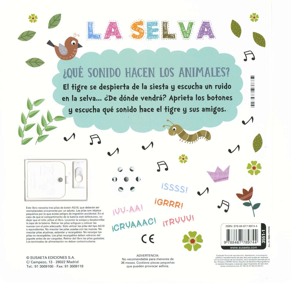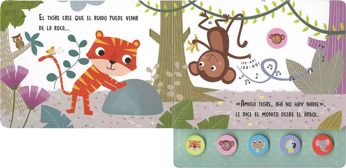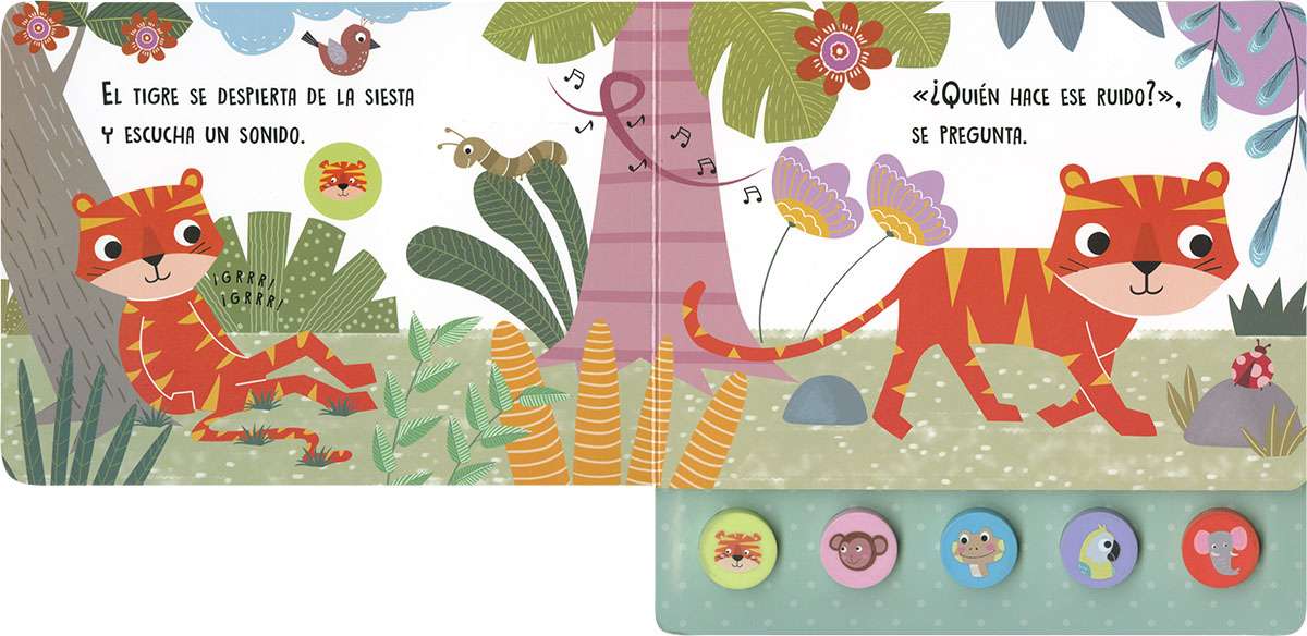El tigre se despierta de la siesta y oye un ruido en la selva... ¿De dónde vendrá? Escucha los sonidos que hacen el tigre y sus amigos apretando los botones de este libro de cartón; como son de silicona, blanditos y suaves, harán que este cuento infantil de sonidos sea tu favorito.