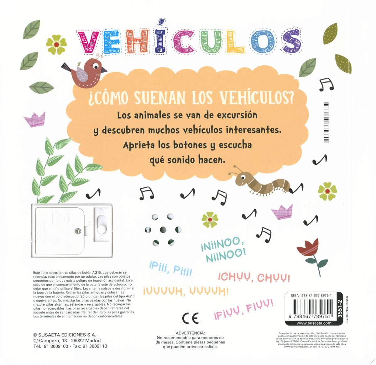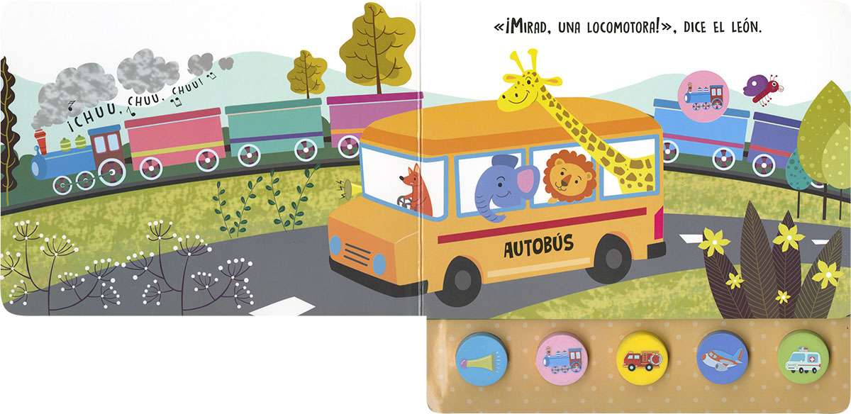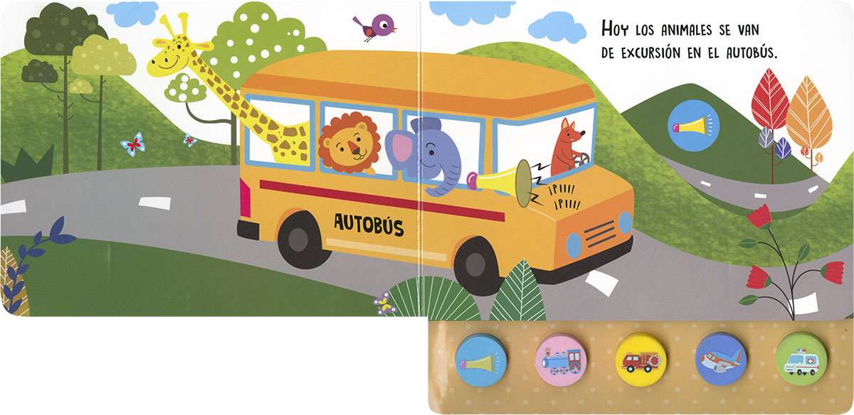 Los animales se van de excursión y descubren muchos vehículos interesantes. Escucha el sonido que hacen los vehículos apretando los botones de este libro de cartón; como son de silicona, blanditos y suaves, harán que este cuento infantil de sonidos sea tu favorito.