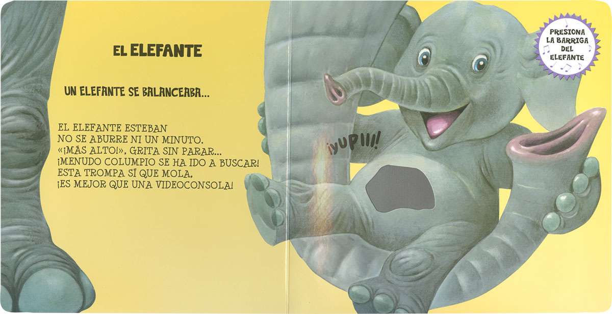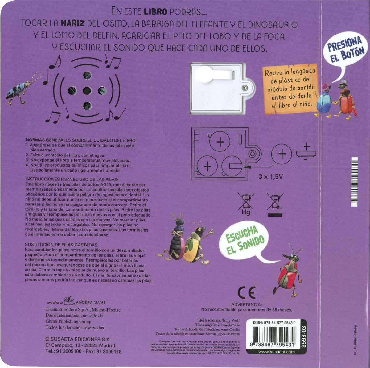 Con este libro de goma EVA podrás tocar la nariz del osito, la barriga del elefante y el dinosaurio y el lomo del delfín, acariciar el pelo del lobo y de la foca y escuchar el sonido de cada uno de ellos.