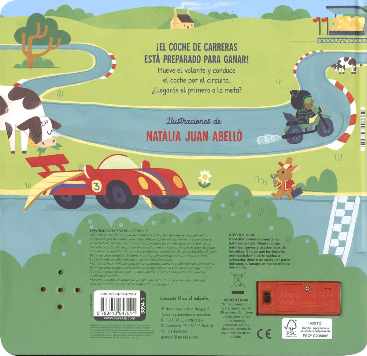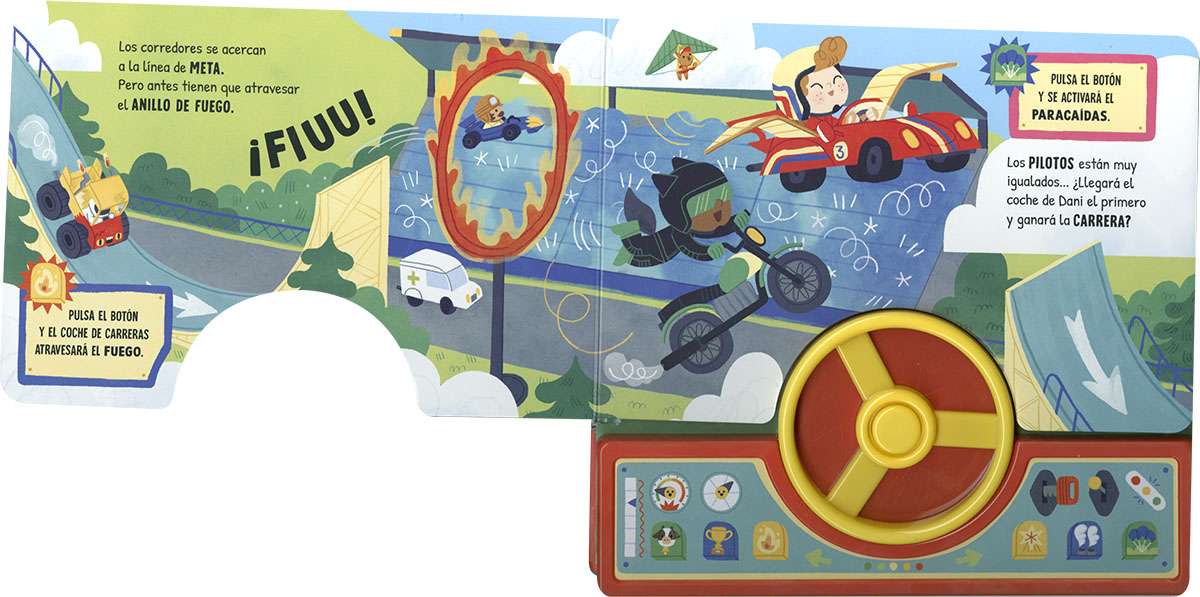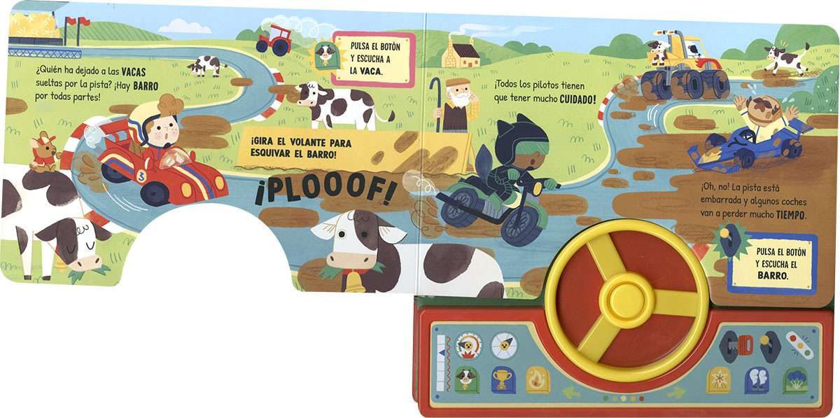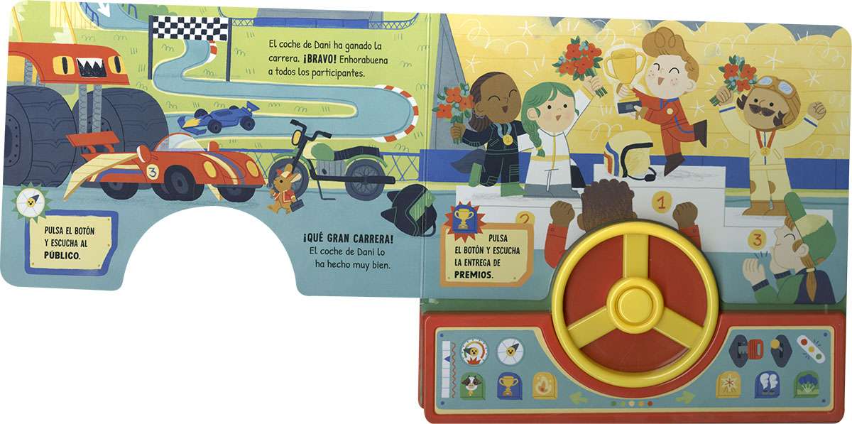 Mueve el volante para seguir esta emocionante carrera en la que pasa de todo: coches que aceleran, competidores que se salen de la pista y otras sorpresas que podrás leer y también escuchar pulsando los botones de sonido de este divertido libro de cartón. ¿Estás preparado? ¡Pues en marcha!