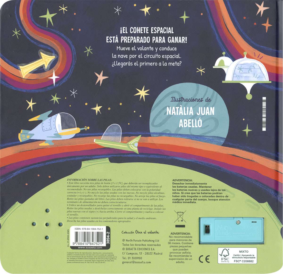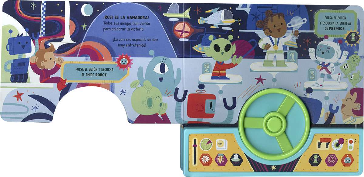 Mueve el volante para seguir esta emocionante carrera espacial en la que pasa de todo: cohetes que aceleran, naves que se bloquean y otras sorpresas que podrás leer y también escuchar pulsando los botones de sonido de este divertido libro de cartón. ¿Estás preparado? ¡Pues en marcha!