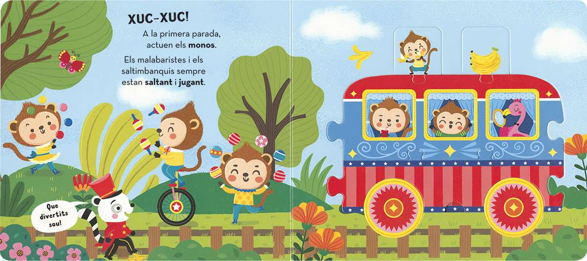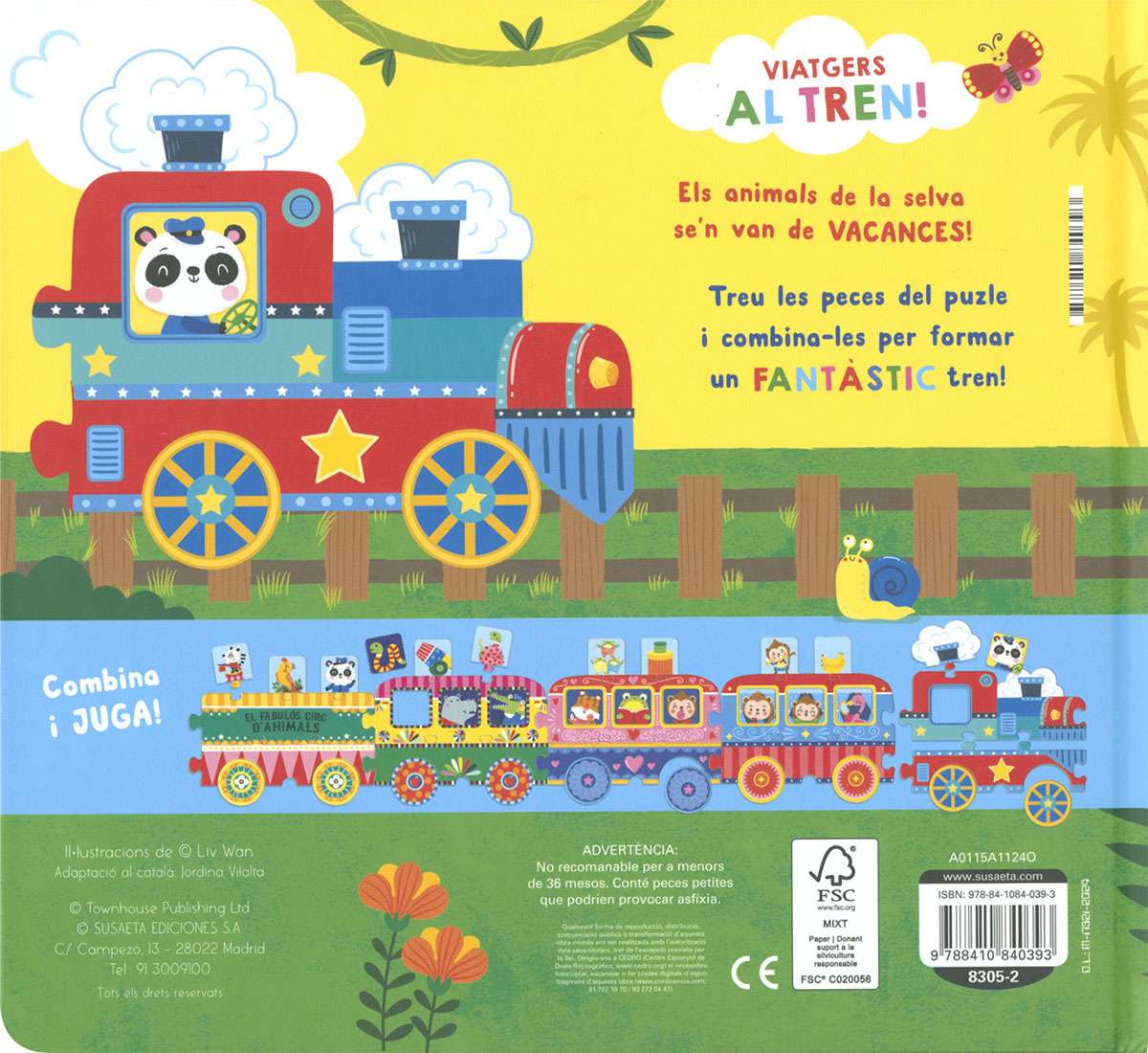 Puja a bord del tren de la selva! Els animals agafen el tren per anar de vacances. Quins llocs visitaran? Esbrina-ho amb aquest preciós llibre puzle. Extreu les peces, munta la locomotora i els vagons i uneix-los per formar un tren fantàstic.