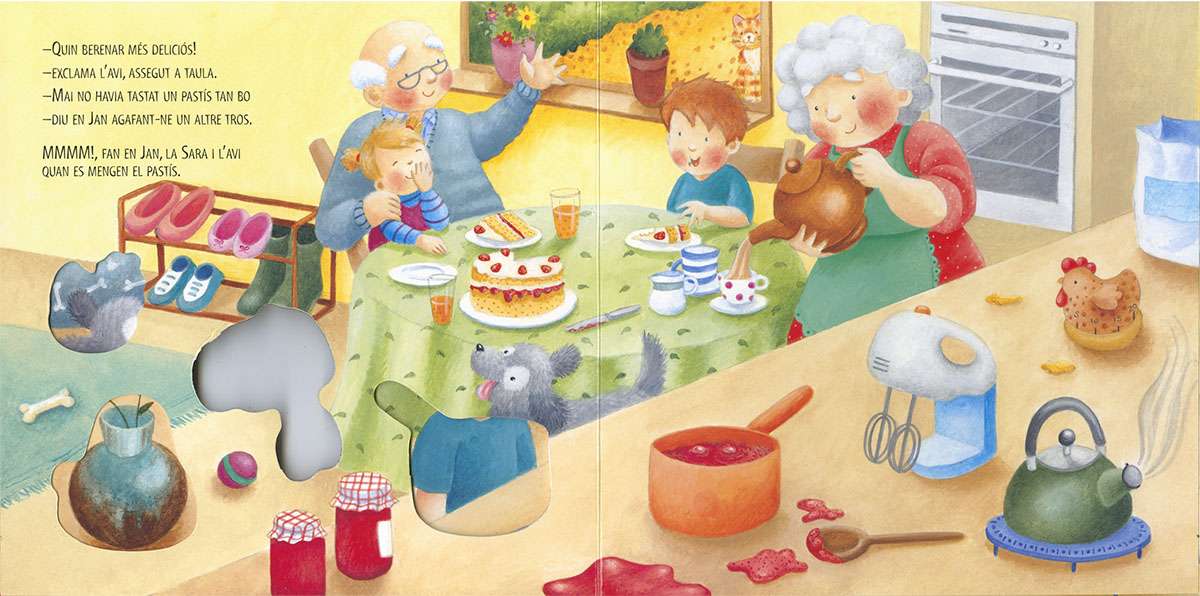 Làvia prepara un deliciós pastís de maduixes. Entra a la seva cuina, juntament amb els seus nets, i descobreix quins aparells utilitza i quin soroll fa cadascun. Un llibre molt entretingut amb una simpàtica història perquè els petits lectors es diverteixin llegint i escoltant com sonen les màquines cada vegada que premen el botó.
