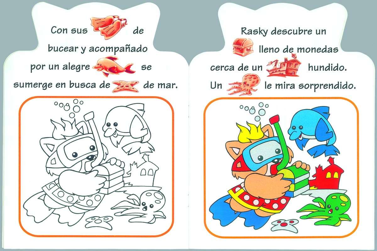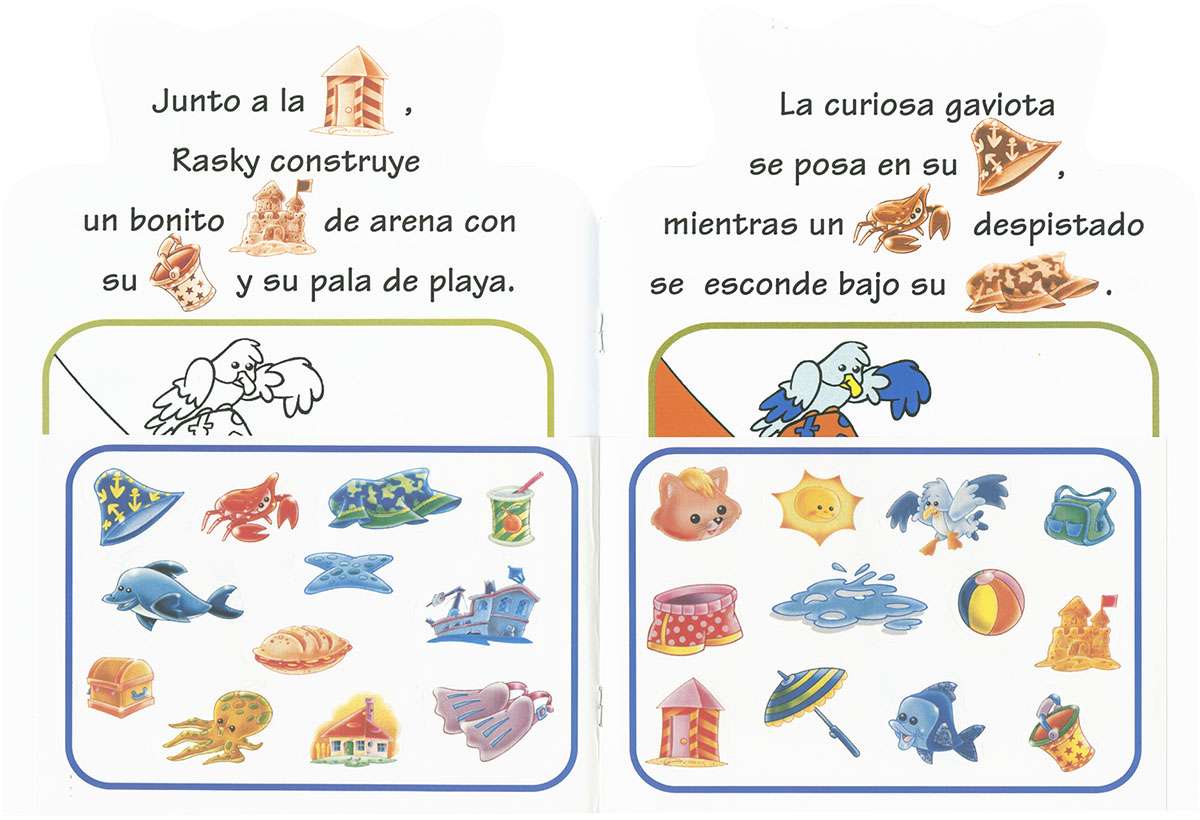Acompaña a Rasky, el gatito, a pasar un estupendo día en la playa. Un simpático cuento troquelado con pictogramas, pegatinas y dibujos para colorear y completar siguiendo el modelo o a tu gusto.