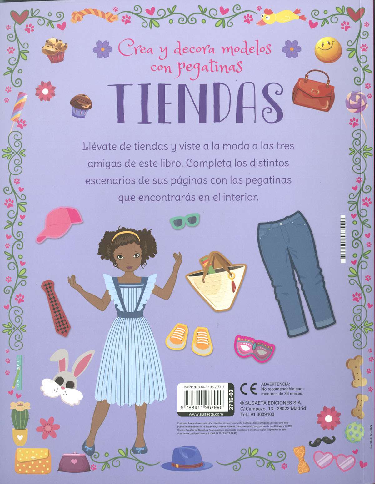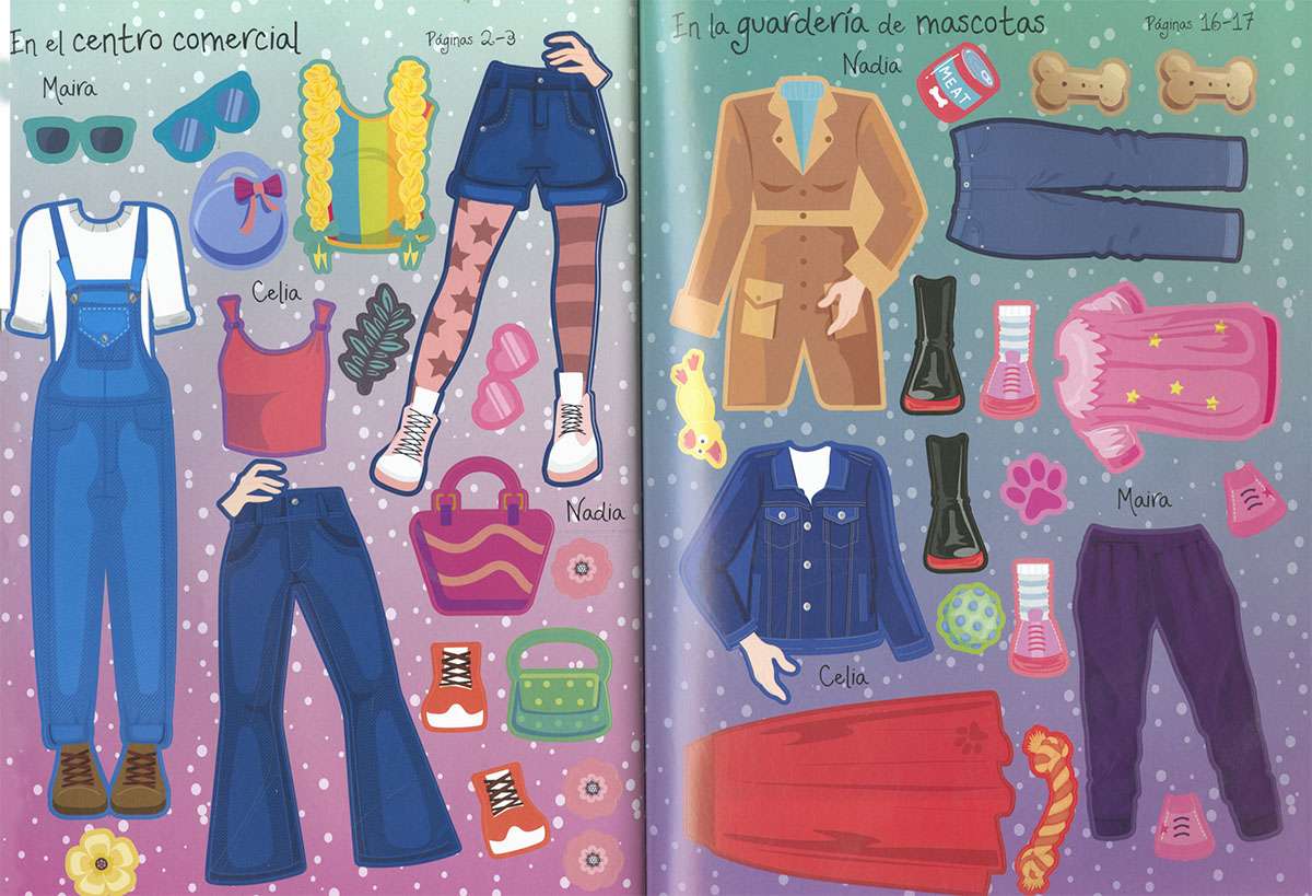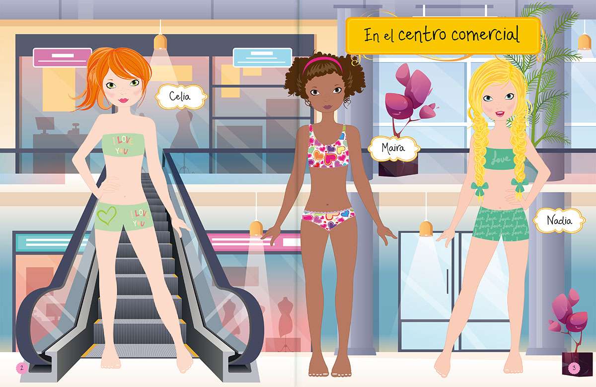 Llévate de tiendas y viste a la moda a las tres amigas de este libro. Completa los distintos escenarios de sus páginas con las pegatinas que encontrarás en el interior.
