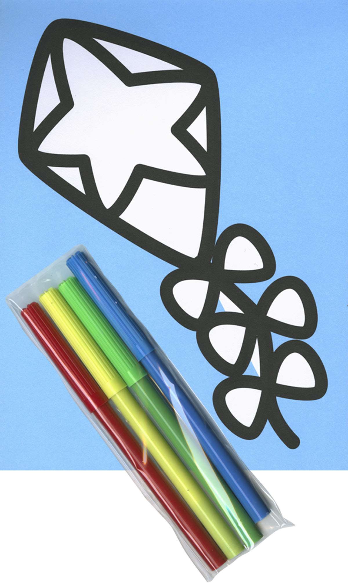 Koadernaketa: Cartulina plastificada y troquelada con asa de plástico, base de cartón y 4 rotuladores